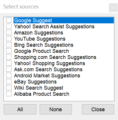 例如,如果您输入关键词 “Buy”,点击 “A-Z ”按钮就会创建关键词 “Buy A”、“Buy B ”和 “Buy C”,以此类推,您就有了 26 个基础关键词来搜索相关关键词。这可以将一个小的初始列表变成一个更大的列表,涵盖以 “Buy ”开头的所有组合。对于 Google,您还可以使用国家扩展名,因此您可以从 Google.fr 或 Google.de 等任何 Google 域名中搜索建议。