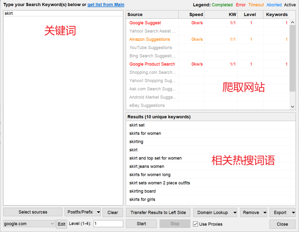 关键字还可以传输到搜索引擎抓取器,让您可以抓取与提取的关键字相关的成千上万个网站和网页,这对研究竞争对手、从不同网站获取反向链接或链接交换非常有益。关键词抓取器还有一个域名可用性检查功能,可帮助您根据热门关键词查找可供注册的域名,非常适合创建新的网站。