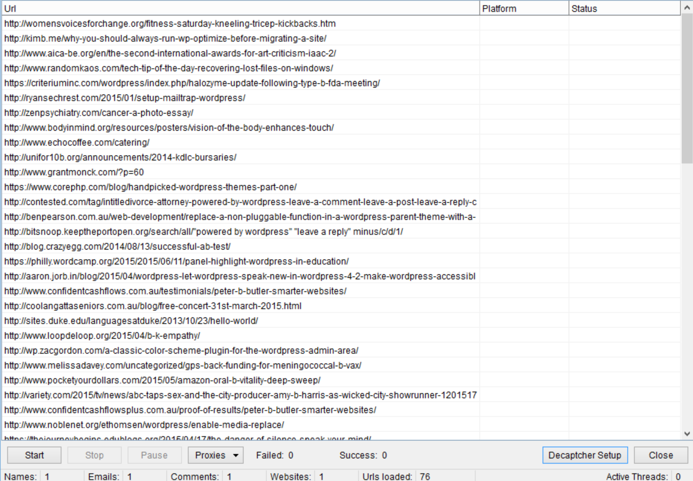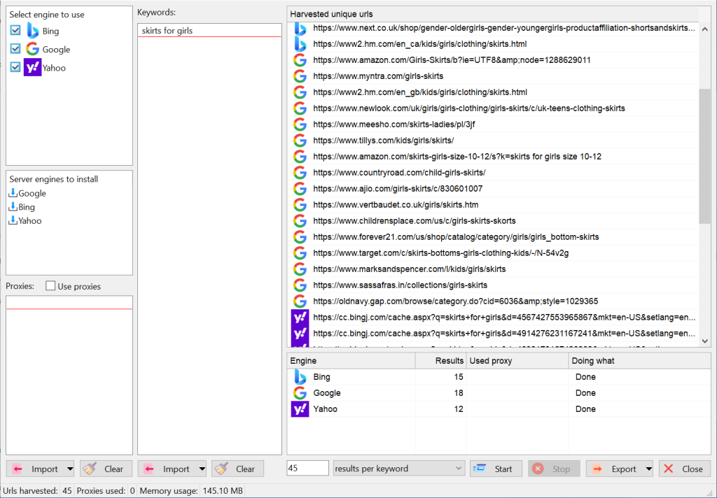 从任何具有搜索功能的网站上抓取 URL。它可以是一个具有搜索功能的简单 WordPress 博客,您想从中获取关于特定关键字相关的所有 URL,也可以是谷歌、必应或雅虎等主要搜索引擎。除了这些主要的搜索引擎外,还包括 Lycos、Ask.com、Rambler、AltaVista、Mojeek、Blekko、Excite、HotBot、IXQuick、DogPile、Blingo 以及 ISP 特定的搜索引擎,如 Charter、Verizon、Comcast 和 Orange.co.uk。甚至还有一个针对 YouTube 的引擎,用于获取 YouTube 视频 URL,以及 Alexa Topsites,用于获取流量排名最高的域名。