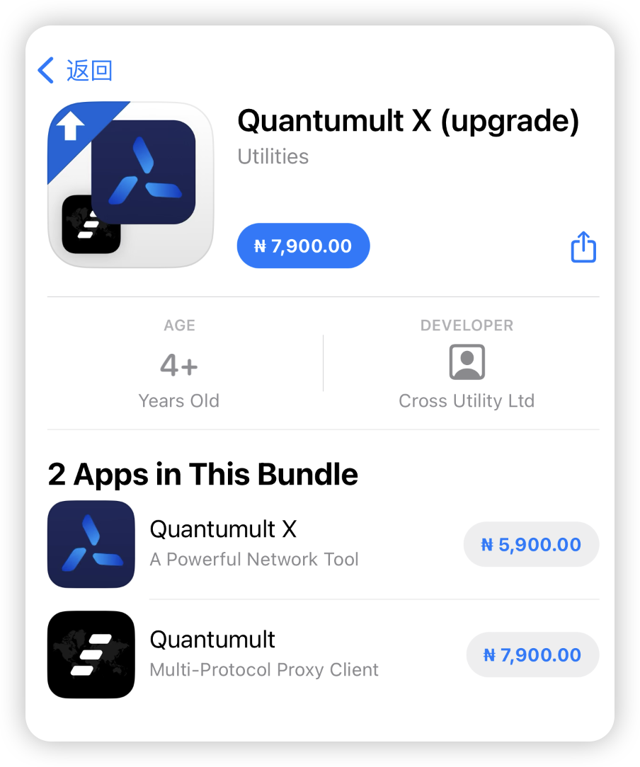 下面以Quantumult X 为例,这个软件IOS全平台通用,只需要5900NGN,2个套餐的话只要7900NGN,购买会自动兑换成美元结算,加上汇率差扣了5.43美金,大概39RMB。。。。。