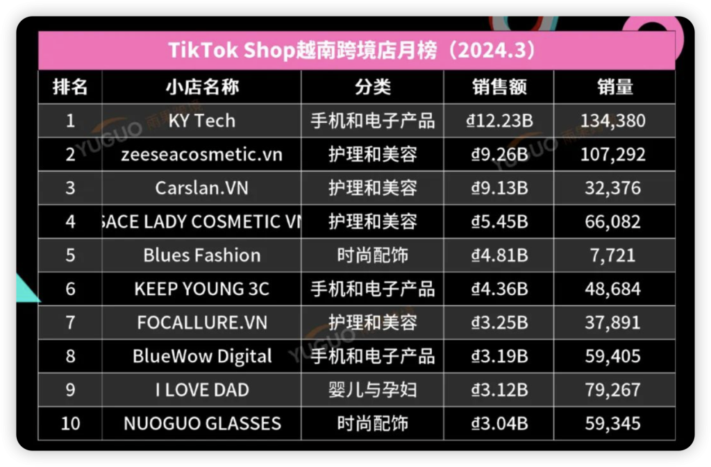 本月越南 Top10 小店 GMV 榜单中,“护理与美容”品类小店占比 4 家,“手机数码”品类小店占比 3 家,“时尚配饰”品类小店占比 2 家,“母婴用品”品类小店仅 1 家上榜。