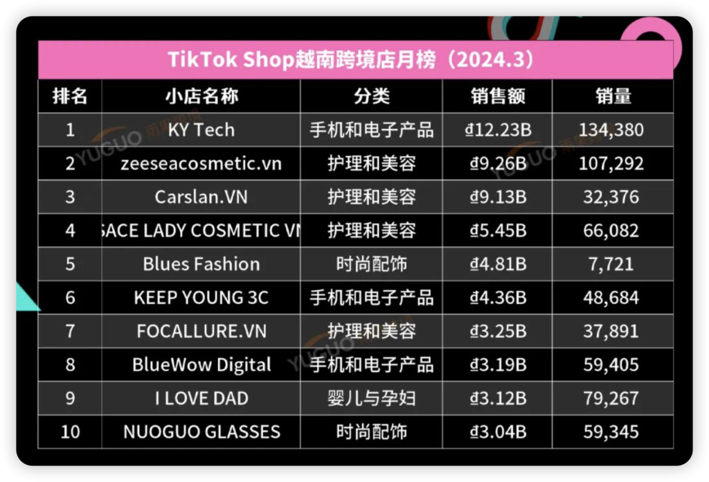榜单排名第一的跨境小店 @KY Tech 主营“手机数码”类目,主要带货模式为视频带货,月销售额达 12.23B 越南盾,销量 134.4K。