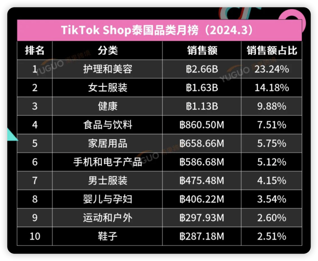 根据 Echotik 数据平台的数据显示,2024 年 3 月, TikTok Shop 泰国市场热销品类的前三位分别为“护理美容”、“女士服装、“健康”,合计占比为 47.3%。其中“护理美容”为当月市场主流消费类目,单类目占比达 23.24%,该品类销量前三的畅销热品有:面膜片、防水眉笔、防晒霜。