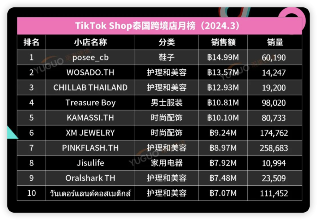 本月泰国 Top10 小店 GMV 榜单中,“护理与美容”品类小店占比 5 家,“时尚配饰”品类小店占比 2 家,“男士服装”、“家用电器”、“鞋子”品类小店则各有 1 家上榜。