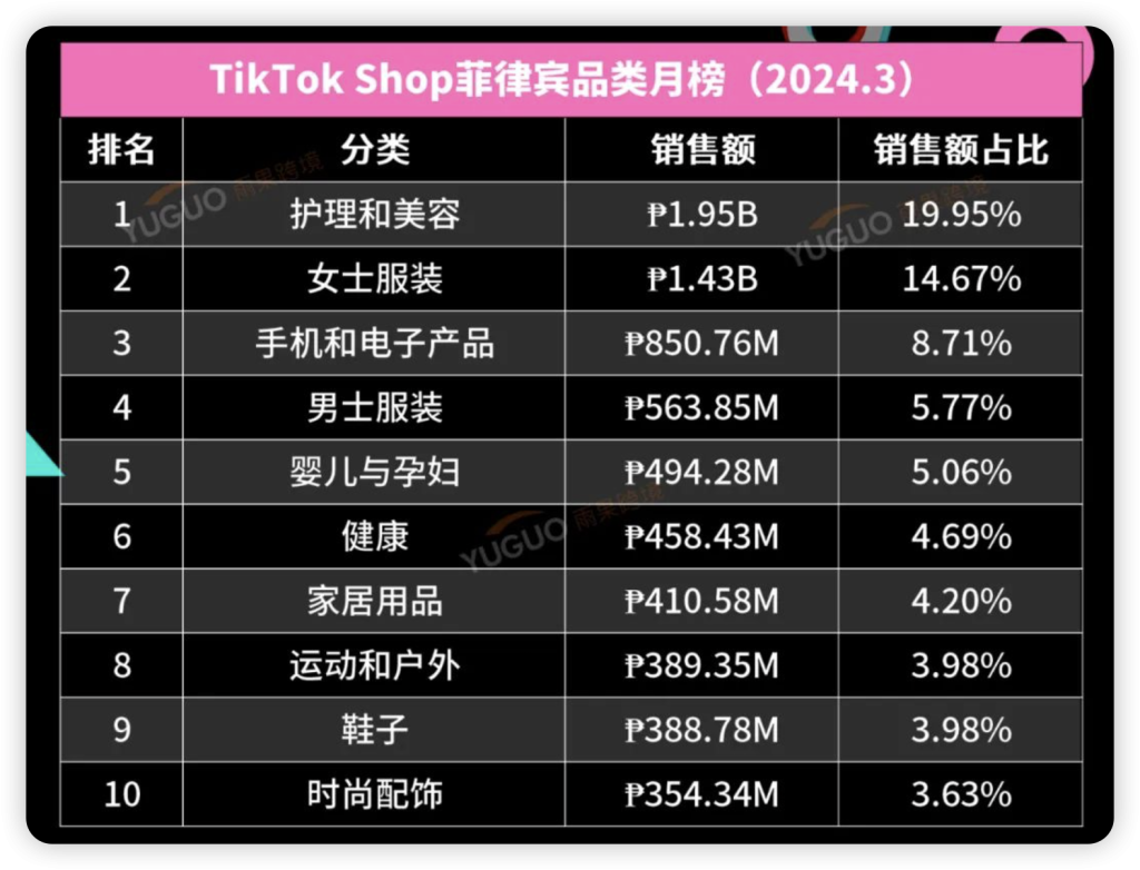 根据 Echotik 数据显示,2024 年 3 月, TikTok Shop 菲律宾市场热销品类的前三位分别为“护理美容、“女士服装”、“手机与数码产品”,合计占比为 43.33%,其中“护理美容”为当月市场主流消费类目,单类目占比达 19.95%,该品类销量前三的畅销热品有:10X男士烟酰胺皂、5 件装身体护理洗浴套件、云南草本美白祛斑膏。