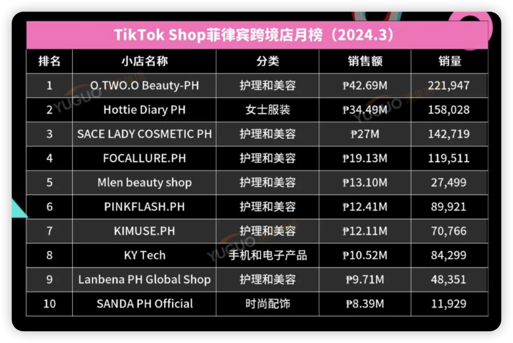 榜单排名第一的跨境小店 @O.TWO.O Beauty-PH 主营“护理美容”类目,主要营销模式为视频带货,月销售额达 42.88M 比索,销量 221.9K。