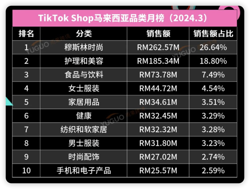 根据 Echotik 数据显示,2024 年 3 月, TikTok Shop 马来西亚市场热销品类的前三位分别为“穆斯林时尚”、“护理美容”、“食品饮料”,合计占比为 52.93%,其中“穆斯林时尚”为当月市场主流消费类目,单类目占比达 26.64%,该品类销量前三的畅销热品有:Khimar 长袍套装、成人棉质手套、CHANELLA 棉质头巾。