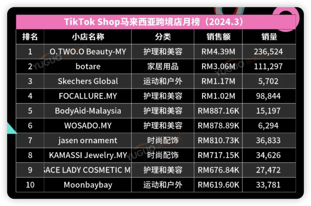 榜单排名第一的跨境小店 @O.TWO.O Beauty-PH 主营“护理美容”类目,主要营销模式为视频带货,月销售额达 4.41M 令吉,销量 236.5K。