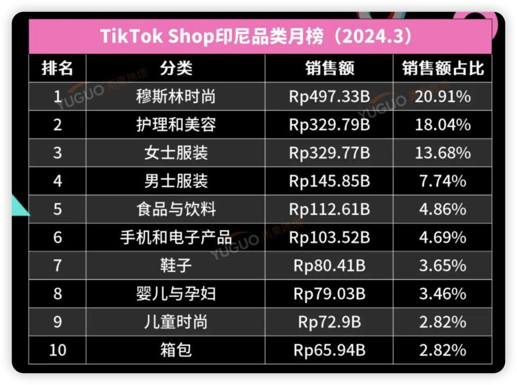 根据 Echotik 数据显示,2024 年 3 月, TikTok Shop 印尼市场热销品类的前三位分别为“穆斯林时尚”、“护理美容、“女士服装”,合计占比为 52.63%,其中“穆斯林时尚”为当月市场主流消费类目,单类目占比达 20.91%,该品类销量前三的畅销热品有:穆斯林女式哑光面纱 、贝拉长方形头纱、奥雷利巴斯米纳面巾。